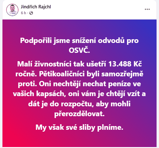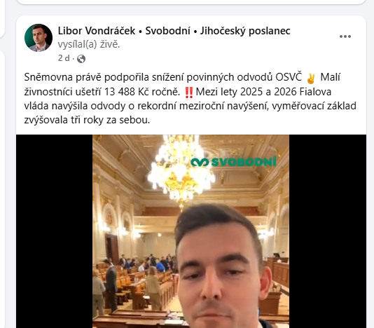 A stejný příspěvek napsal i šéf Svobodných Libor Vondráček: Sněmovna právě podpořila snížení povinných odvodů OSVČ. Malí živnostníci ušetří 13 488 Kč ročně.