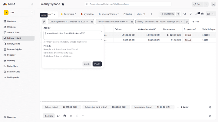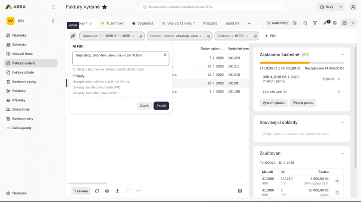 Při filtrování dat už díky AI nemusíte zdlouhavě vyhledávat různá kritéria pro omezení. AI dokáže pracovat s otázkou v přirozeném jazyce a na základě ní připravit systémové filtrační „čipy“, které odpovídají kritériím pro vyhledávání. Tato funkce významné zjednoduší a zrychlí práci uživatelům webových verzí systémů ABRA Flexi i ABRA Gen.